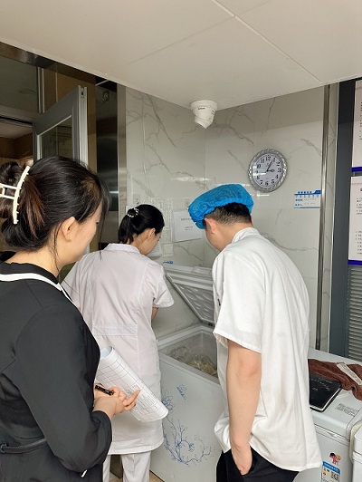 在医院厨房,从食材的溯源标签到操作台的卫生状况,逐一排查,只为守护孕产妇及患者“舌尖上的安全”。